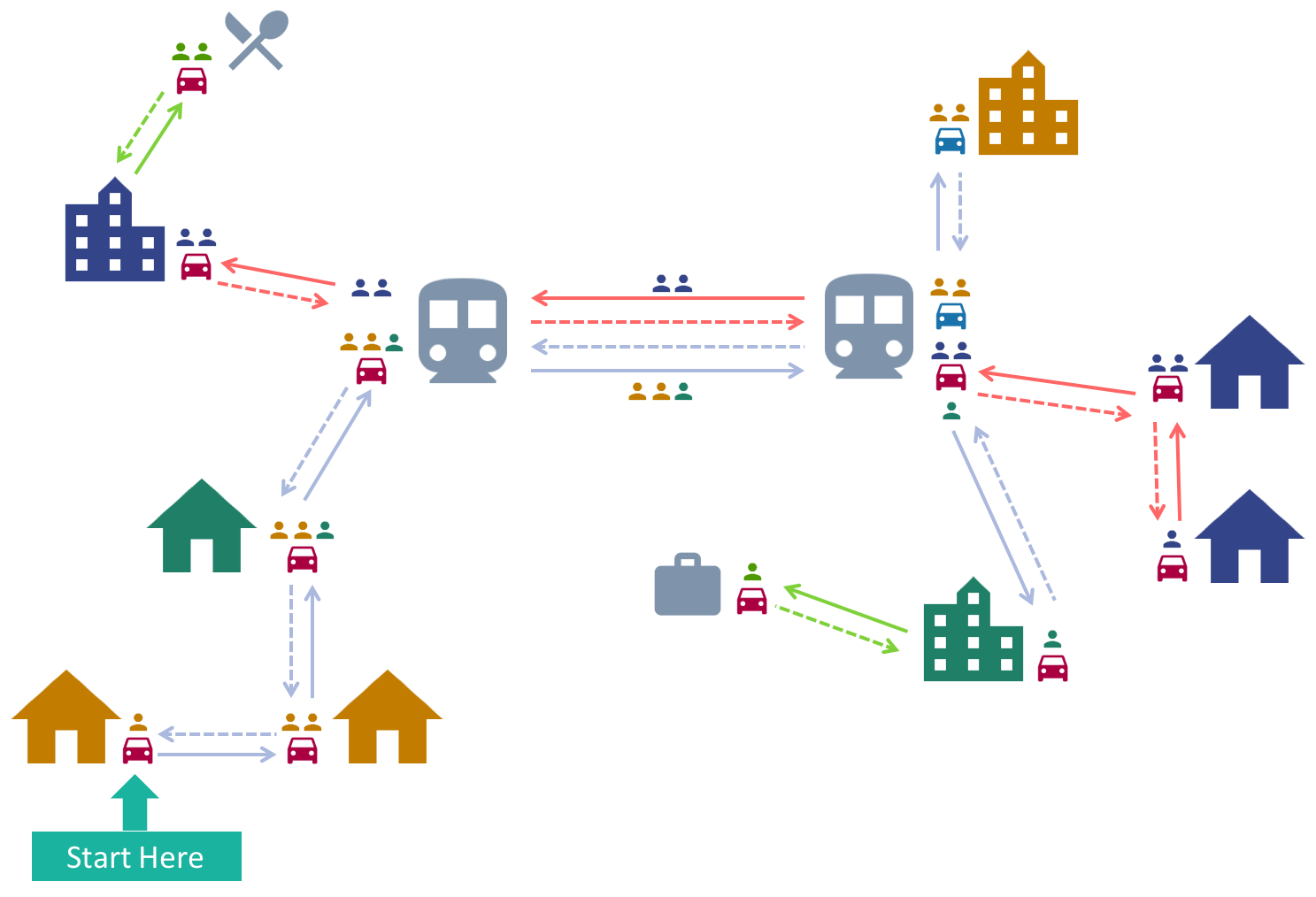 Solid arrows represent the morning commute and dashed arrows the evening commute.
