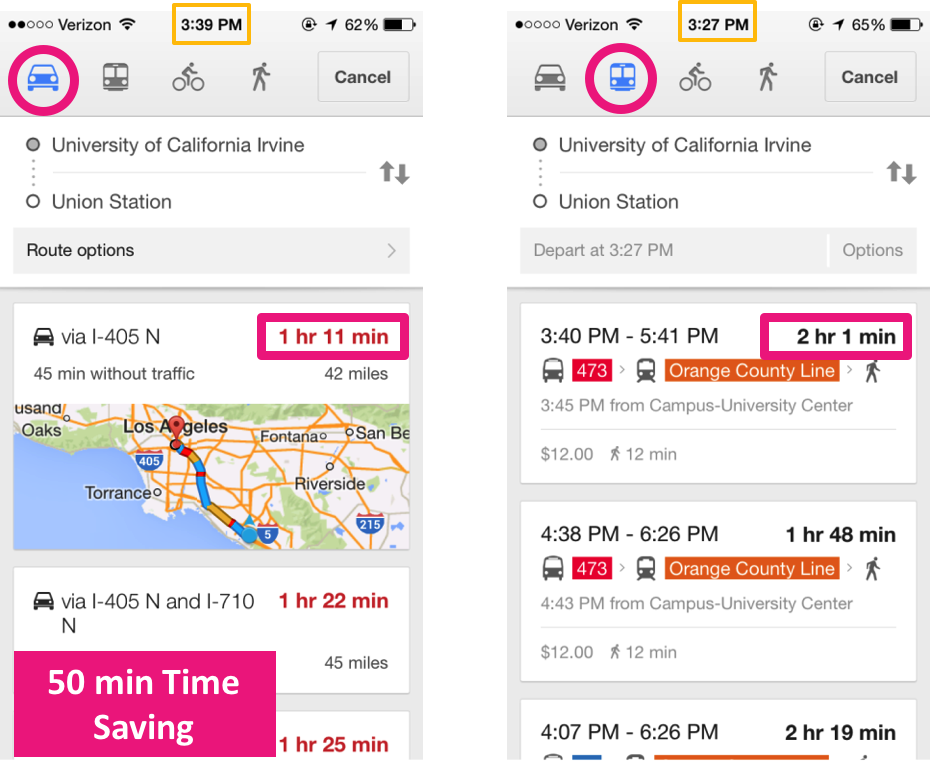 - It is 50 min faster to drive than taking transit (UCI-LA)